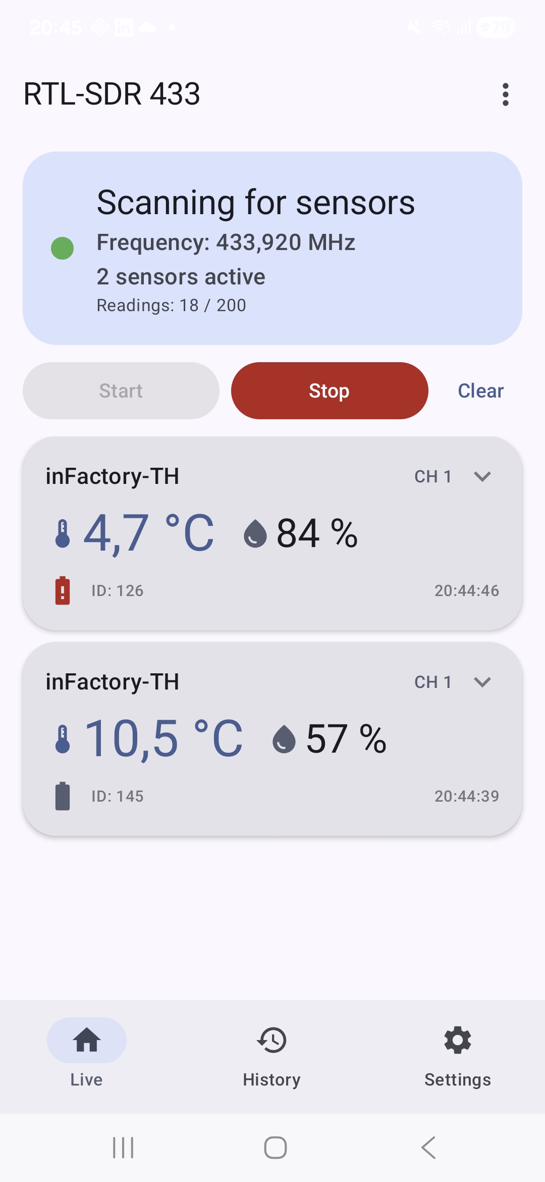 Tap the Start button on the Home screen. The status card changes to Running (green dot) and the active frequency is shown. rtl_433 starts scanning and decoded sensor packets appear as cards below.