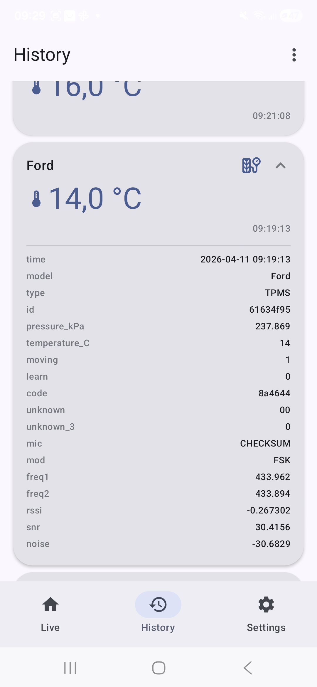 Tap the History icon in the bottom navigation bar to see a full chronological log of every decoded packet. This is useful for checking how often a sensor transmits or for spotting intermittent issues.